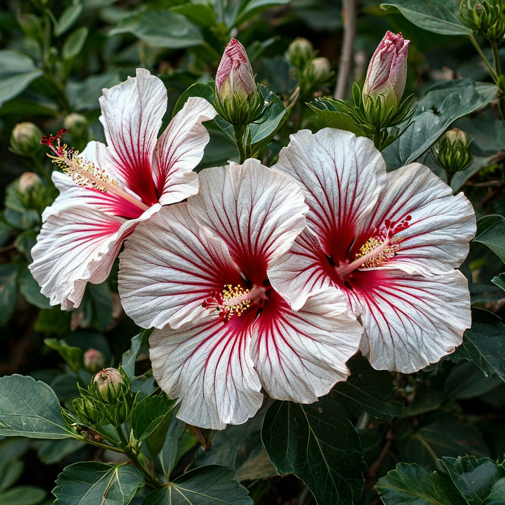 - Белый цвет с красными прожилками: главная особенность этого сорта — его утончённая и запоминающаяся окраска. Цветки гибискуса “Рэд Элеганс” имеют чистый белый цвет, который является прекрасным фоном для ярких красных прожилок, создающих неповторимый рисунок.
