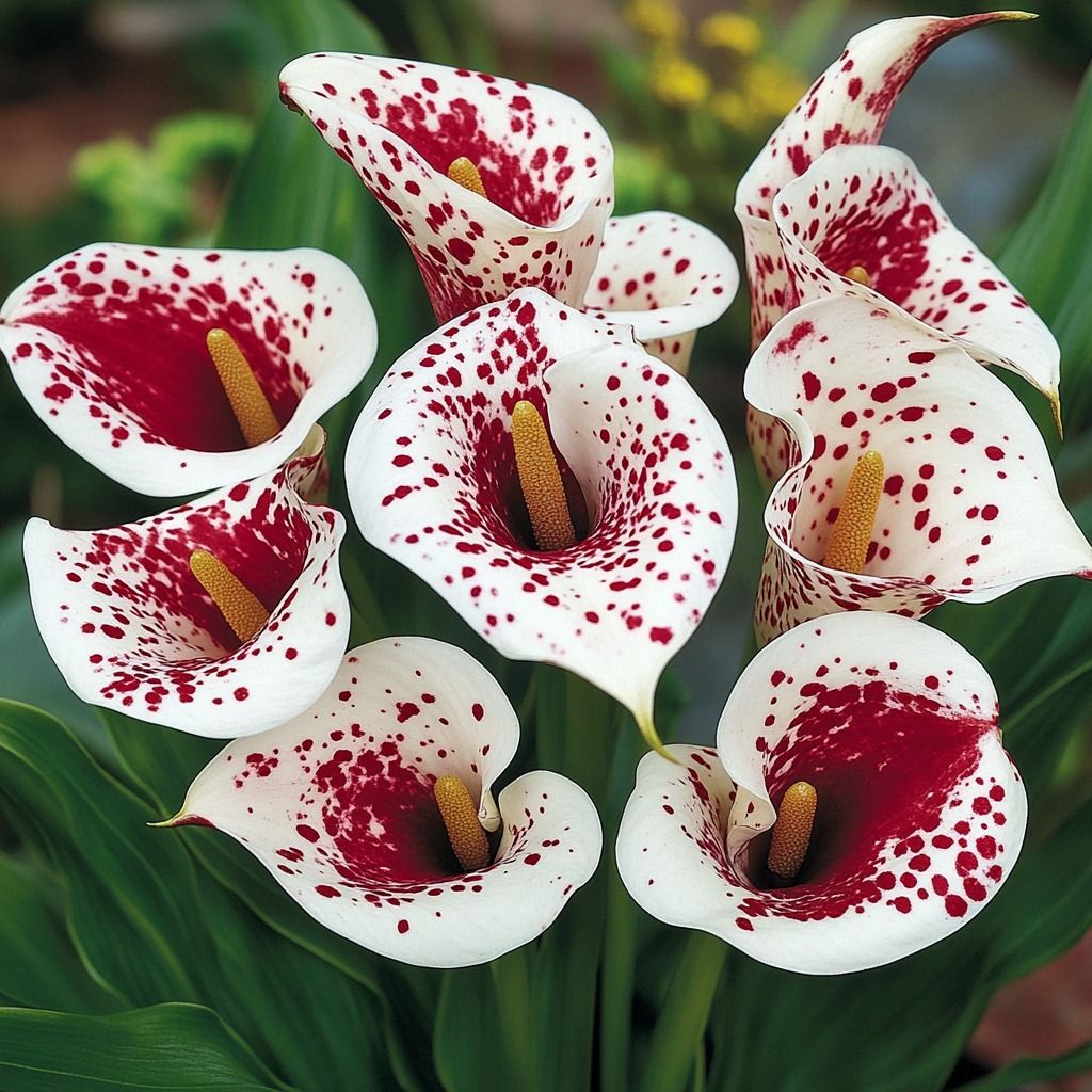 Уход: Каллы нуждаются в регулярном поливе, особенно в период активного роста и цветения. Подкормку следует проводить комплексными удобрениями для цветущих растений каждые 2–3 недели. После цветения полив следует постепенно сокращать, а клубневые каллы можно выкопать и хранить в сухом прохладном месте до следующей весны. Зимой комнатные каллы нуждаются в периоде покоя, поэтому полив следует значительно сократить и перенести растение в более прохладное место. Важно следить за влажностью воздуха, особенно в отапливаемых помещениях, и при необходимости опрыскивать листья водой.